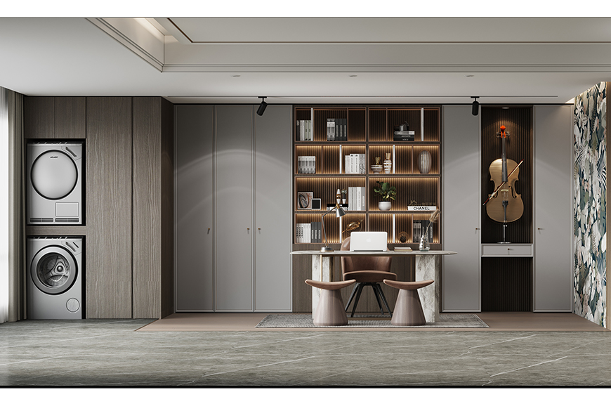產(chǎn)品亮點:書房與陽臺、客廳采用「半融入」設(shè)計手法,打造交流無障礙空間。噴繪裝飾板,提供個性化定制。采用柜中柜結(jié)構(gòu)設(shè)計,將套色融入到家具中,提升了產(chǎn)品的層次感