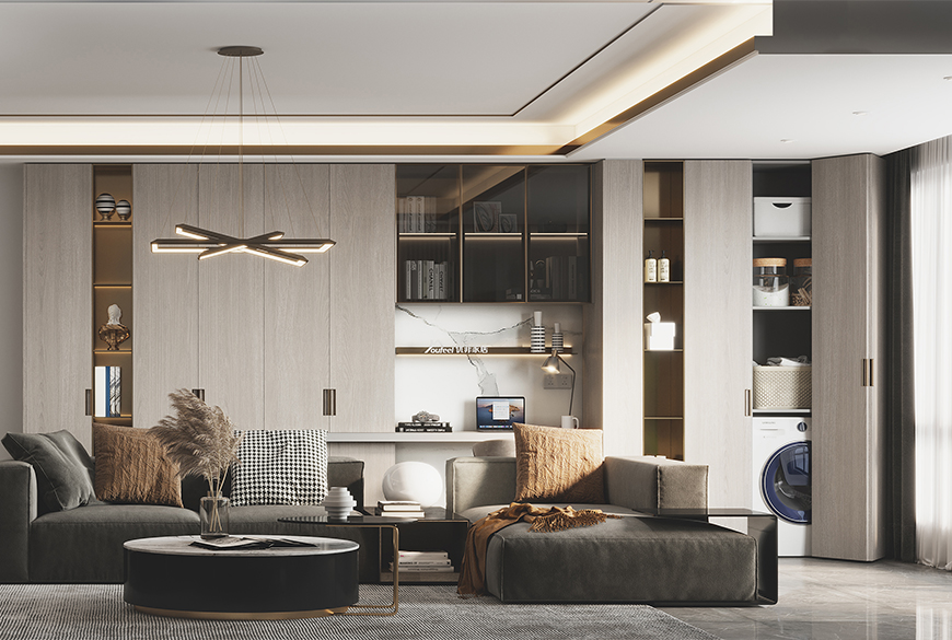 產(chǎn)品亮點(diǎn):一字型超長(zhǎng)辦公區(qū)設(shè)計(jì)將書柜、儲(chǔ)物、家政、展示、辦公完美融合,讓家人各自忙碌,又共處一室,各自交流