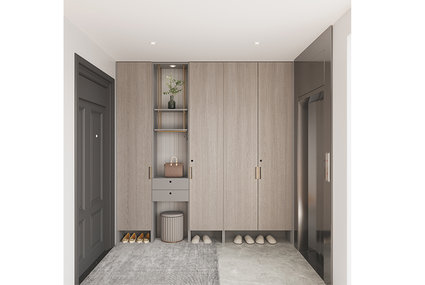 產(chǎn)品亮點:玄關(guān)柜在入戶門與電梯之間,加裝指紋鎖設(shè)計,可有效保護財產(chǎn)安全。開放金屬吊柜、格柵背板等元素,滿足公共空間的顏值需求